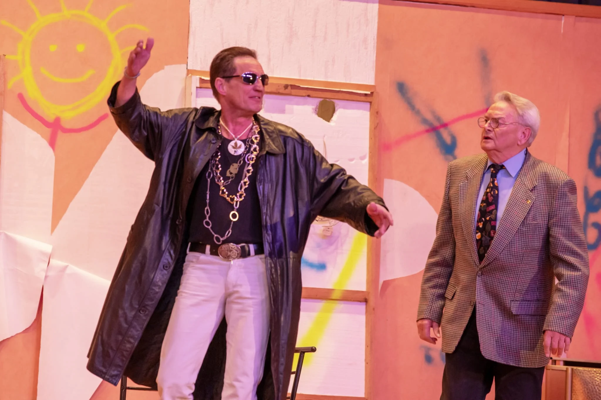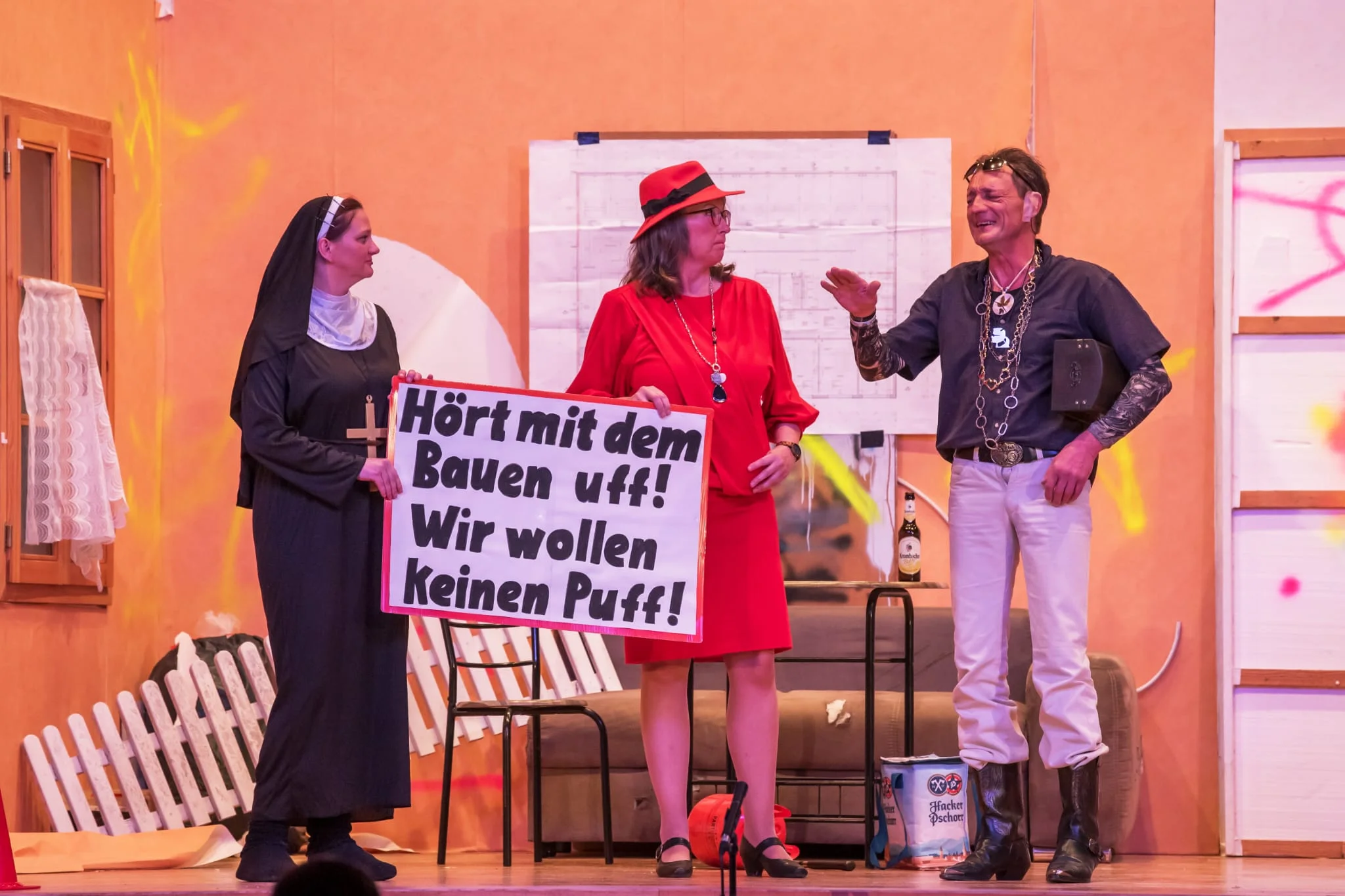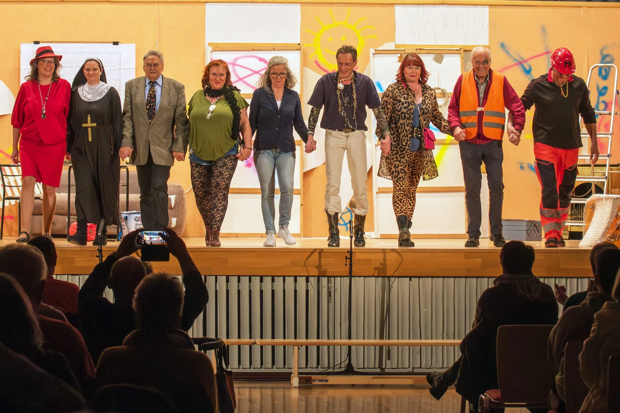 v.l.: wilde Hilde (Bärbel Wölfl), Schwester Anna-Maria (Jaqueline Rogler), Bürgermeister Gunnar Raffke (Wolfgang Unger), Jacky (Natascha Wocke), Marlene Pfusch (Dorothea Schneider), Calle Hansen (Lutz Günther), Madame Petronella (Beata Hanisch), Leo Pfusch (Edmund Jung), Ali (Markus Hanisch)